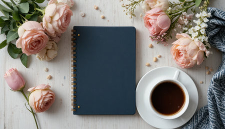 A cozy scene features a dark notebook, a cup of coffee, and soft pink flowers scattered around on a wooden surface.
