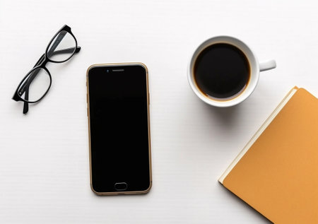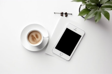 Generative AI : navy blue cup of coffee with smartphone white table flat lay top view