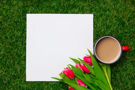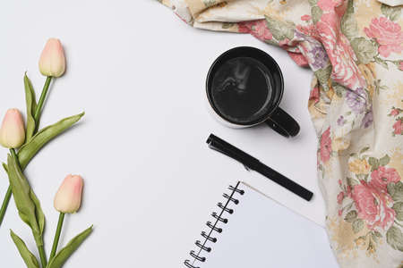 Minimal workplace with white tulips bouquet in a pot, coffee cup and notebook. Copy space for advertise text or information content.