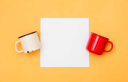 Coffee cup and white mockup blank on color geometric background, template for designer