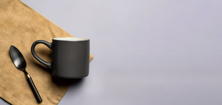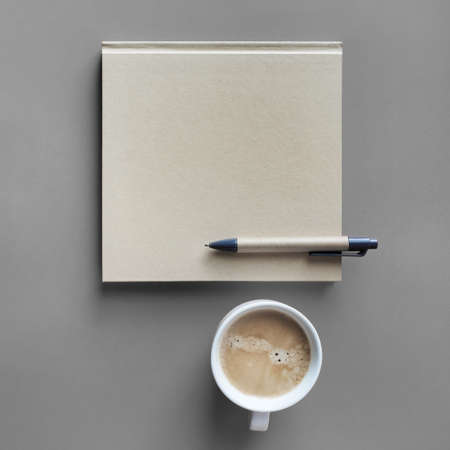 Blank kraft book, pen and coffee cup on gray paper background. Template for branding design. Top view. Flat lay.