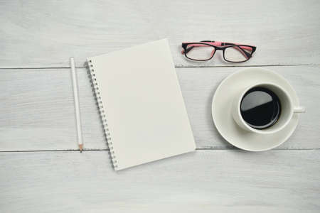 blank notebook mockup with cup of coffee, glasses and pencil on white wooden background. Top view. copy space.
