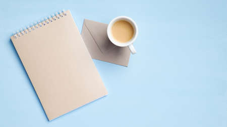 Modern office desk table with paper notebook, envelope, cup of coffee on blue background. Flat lay, top view stylish feminine workspace. Business concept