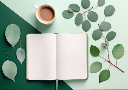 Flat lay with blank notebook, cup of coffee and eucalyptus branches on green background