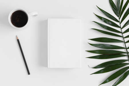Top view of a white book mockup with workspace accessories and a palm leaf on a white table.