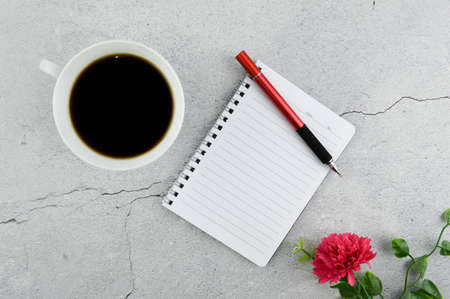 Flat lay view of pen, cup of coffee and notebook with copy space.