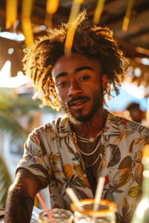a man with dread hair in front of a group of people who are standing and talking to each other men. Generative Ai