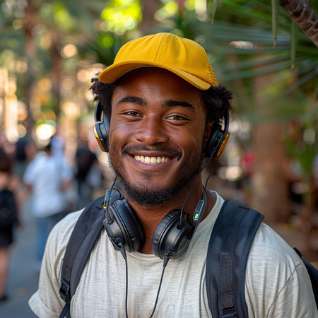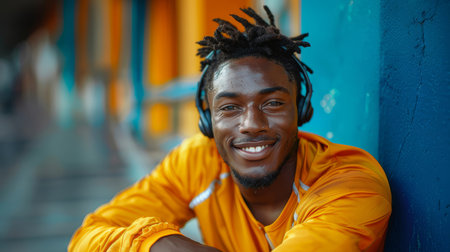 Handsome African man adjusting his headphones and smiling outdoors while wearing a vibrant yellow jacket. The colorful background adds a lively atmosphere.
