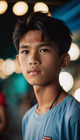 A young boy, around twelve years old, gazes thoughtfully at the camera while standing amidst a colorful evening market in Thailand.