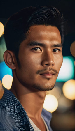 A young man living in Thailand stands confidently with a calm expression. The background is filled with soft bokeh lights, creating an inviting atmosphere during the evening.