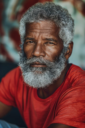 A portrait of a senior African American man with a beard wearing a red shirt.