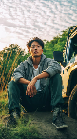 Generative AI : Happy young asian man hipster sitting on the ground outside a car and using mobile smart phone videocalling with his friend Summer holiday weekend travel concept Cl