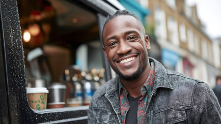 Happy African American man in denim jacket stands by food truck, highlighting lively street food scene and warm community vibe in bustling urban environment