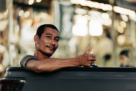 Khao Lak, Thailand, 16 11 2025: A smiling moustached Thai man sits in the back of a pickup truck and holds his finger up. This is how workers are transported after work in Thailand, traffic safety