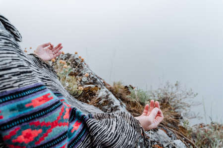 fingers folded in mudra against the background of mountains and fog, a state of peace and tranquility, Zen, yoga in nature