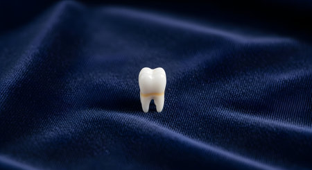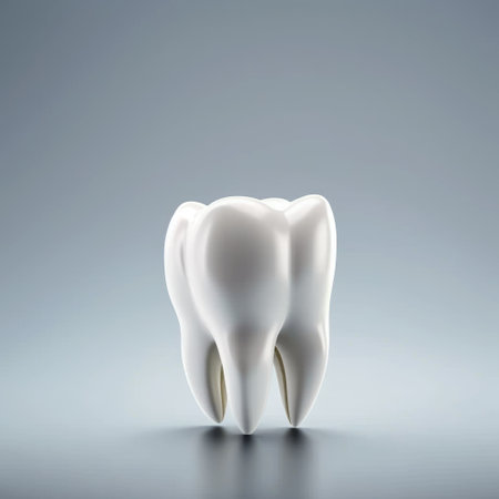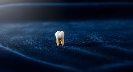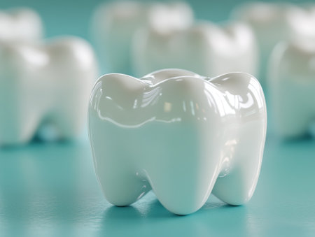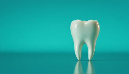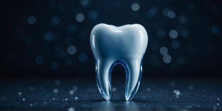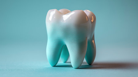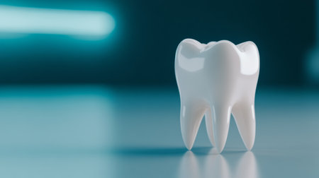 A detailed image of a shiny white tooth resting on a reflective surface, set against a blue gradient background. The tooth's smooth surface and realistic details.