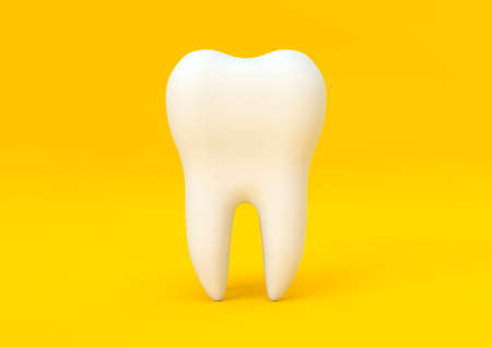 Dental model of premolar tooth on yellow background. Concept of dental examination teeth, dental health and hygiene. 3d rendering illustration