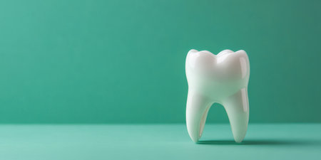 A shiny white tooth model stands prominently on a teal background, highlighting the importance of dental care and oral hygiene for maintaining healthy teeth.