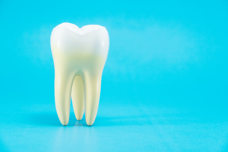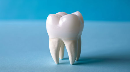 Model of a human molar tooth on blue background, depicting dental health and anatomy