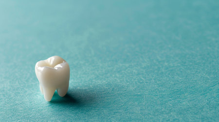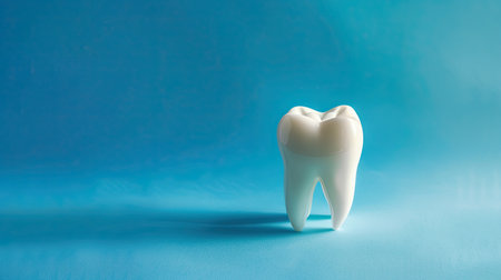 A pristine snow white molar stands out prominently against a soothing blue background, illustrating the essence of dental health and hygiene in a contemporary setting. This visual emphasizes the importance of maintaining strong, healthy teeth.