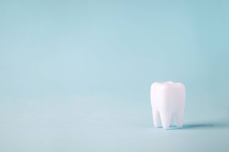 Dental care concept, Healthy tooth model on blue background with copy space. Minimal dentistry, oral tooth hygiene concept