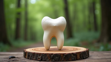 A white tooth featuring a unique wooden texture is displayed on a rustic table, set against a serene forest background. The natural elements and textures blend harmoniously, symbolizing a wholesome and earthy essence.