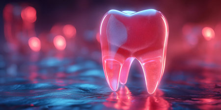 a glowing, transparent tooth in a surreal, neon lit environment, symbolizing advanced dental technology and healthcare. High quality photo