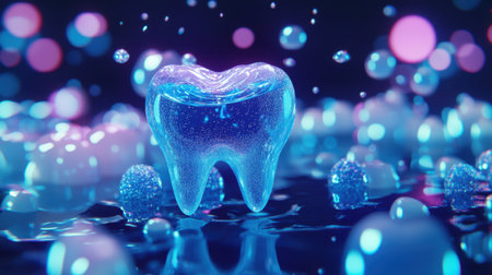 Conceptual representation of dental health displaying a translucent tooth in vibrant colors and bubbles, ideal for dental care, hygiene, and wellness themes.