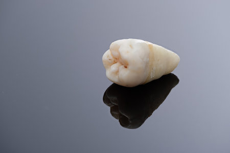 Shiny white tooth model standing on reflective surface, representing importance of dental hygiene, oral health, and preventative care in dentistry and medical industry