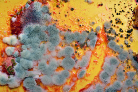 Close-up photo of a pattern of multicolored mold. several different colonies that have grown on organic nutrient medium.