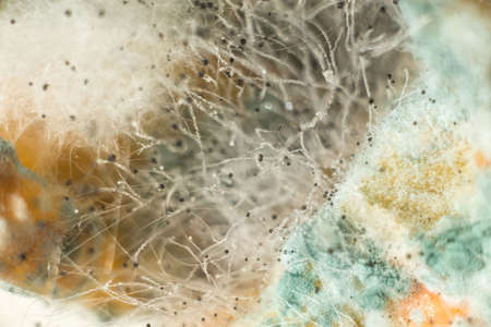 Mold close-up macro. Moldy fungus on food. Fluffy spores mold as a background or texture. Mold fungus. Abstract background.