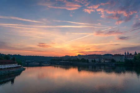 Sunrise in Prague with Vltava river and historic waterfront buildings. European capital cities at sunrise