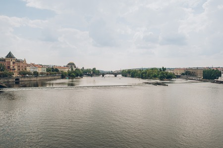 Prague, Czech Republic - September 22, 2018: Panorama of the Lesser town and Vltava river from the Charles Bridge
