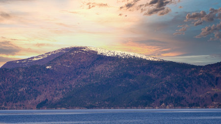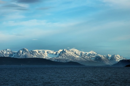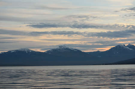 Fjord with snow covered mountains on horizon and sunset with shining clouds. The water glitters in Norway. Landscape photo from the north