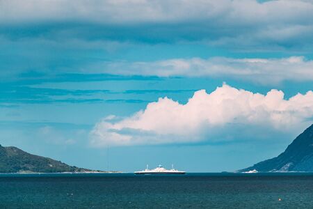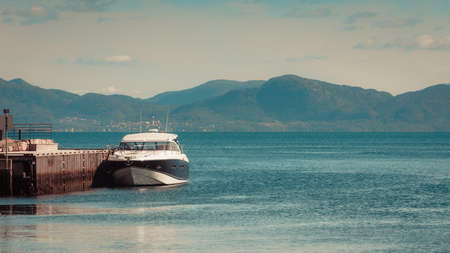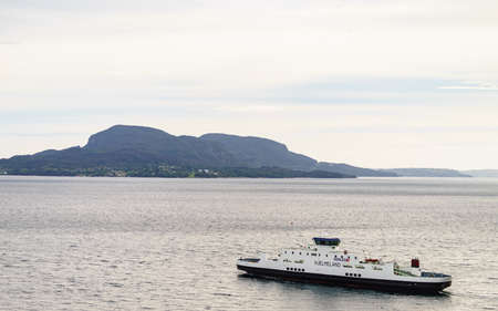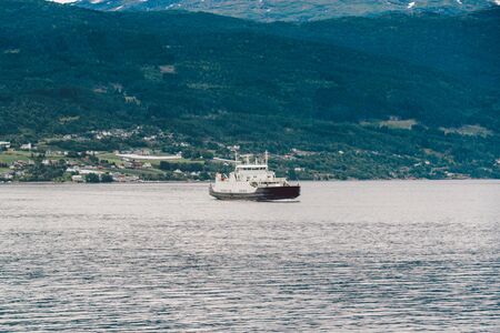 Ferry boat transportation Norway. White passenger ferry goes on fjord. In Norway. ferry crossing a fjord. Ferryboat cruising on Norwegian fjord.
