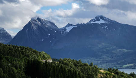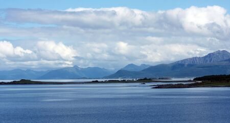 The beautiful Helgeland coast near the arctic circle border in Nordland county, Norway. The coast here is known for its steep mountains and islands, many of them are over 500-metres above sea level.
