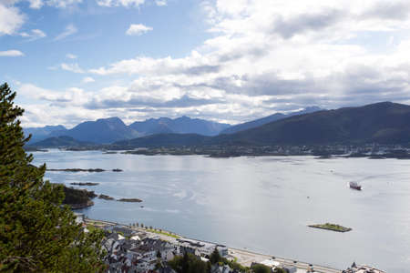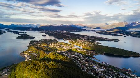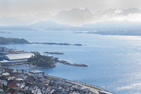 Norway Sunnmore district landscape. View from Nihusen mountain with Hessa, Godoya and Ellingsoya islands. Ellingsoyfjorden fiord.