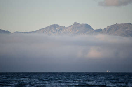 fog shrouded mountain range and fishing vessel on fjord in the distance