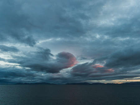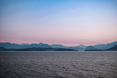 Early morning in the ocean and mountains near Vancouver Island. beautiful sunrise. Dawn over the sea and mountains. Nobody, travel photo, copy space for text