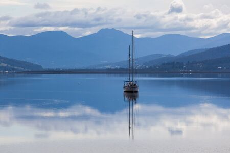 Sailboat reflecting in calm waters of Huon River. Huon Valley, Tasmania, Australia.