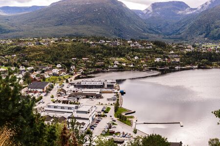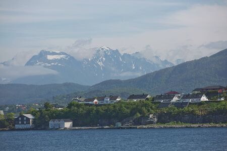 Road in Norway along the fjord on sunny day. Norwegian village on the coast.