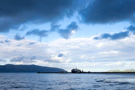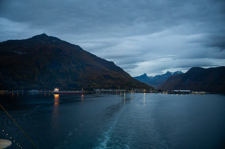 Narvik, Norway, harbor scene at dusk, with a ship leaving a trail in the calm waters, framed by towering mountains and a cloudy sky