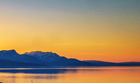 view of the polar town of Tromso in northern Norway and the snowy hills in the background at sunset. Orange-red color lines rocky mountains. Exploring the world. A Scandinavian city and beauty of nature.