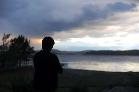Single woman silhouette on a beach at seacoast of Jomfruland Island in Norway for outdoor advertisement during sunset at dusk in the evening