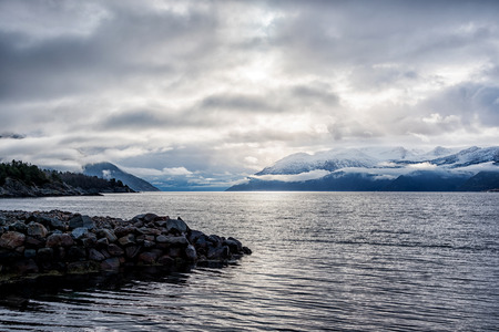 View of Norwegian fjord, with snowcaped mountains in the distance, under a stormy sky.