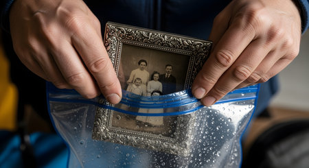 A person's hands carefully seal a vintage, sepia-toned family photograph in an ornate silver frame inside a clear, waterproof plastic bag. This act signifies the protection of precious memories, heirlooms, and valuables from potential water damage during a flood or emergency.
