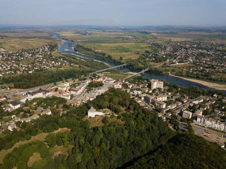 Aerial view of ruined medieval Halych Castle and view to city Halych, Ivano-Frankivsk region, Ukraine