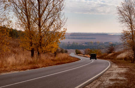 winding rual road inside colorful autumn forest with black car
