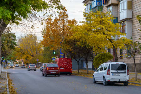 Autumn evening view of a city road with cars. Background with copy space for text. Illustrative editorial. October 21, 2021 Balti Moldova.