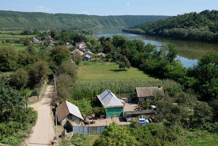 Beautiful view of the Dniester river and village Ustechko, Ukraine - during bicycle trip with panniers